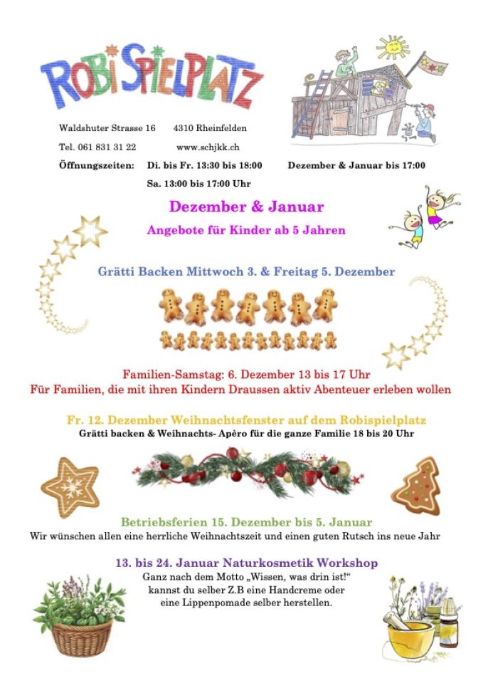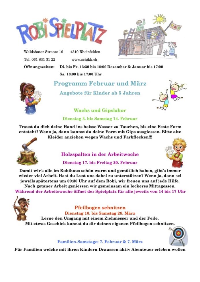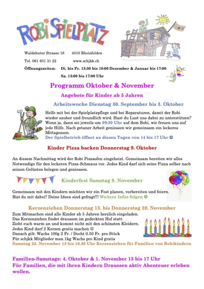 Der vom Verein „schjkk“ (Rheinfelder Trägerverein für Schüler-, Jugend- und Kinderkultur) getragene RobiSpielplatz ist ein ganzjährig geöffneter Spielbetrieb, der Kindern einen attraktiven „Mix“ von Freiraum und Betreuung anbietet. Hier können 5 - 12jährige Mädchen und Buben ihre Freizeit aktiv gestalten. Damit alle Kinder mitmachen können ist eine Mitgliedschaft freiwillig. Fast alle angebotenen Programme sind kostenfrei und benötigen keine Anmeldung.